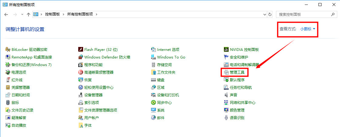 1、打開控制面板,將查看方式切換為小圖標(biāo)后,點(diǎn)擊“管理工具”。如下圖: