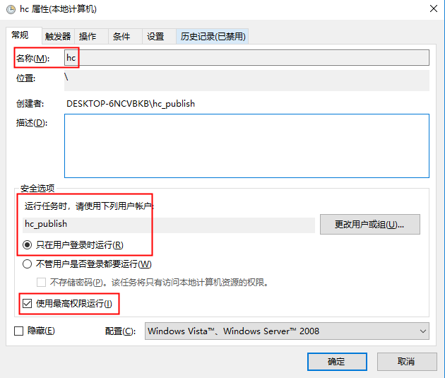 4、輸入一個(gè)名稱,并勾上使用最高權(quán)限運(yùn)行。如下圖:(注:用戶賬戶必須為本機(jī)登錄賬戶)